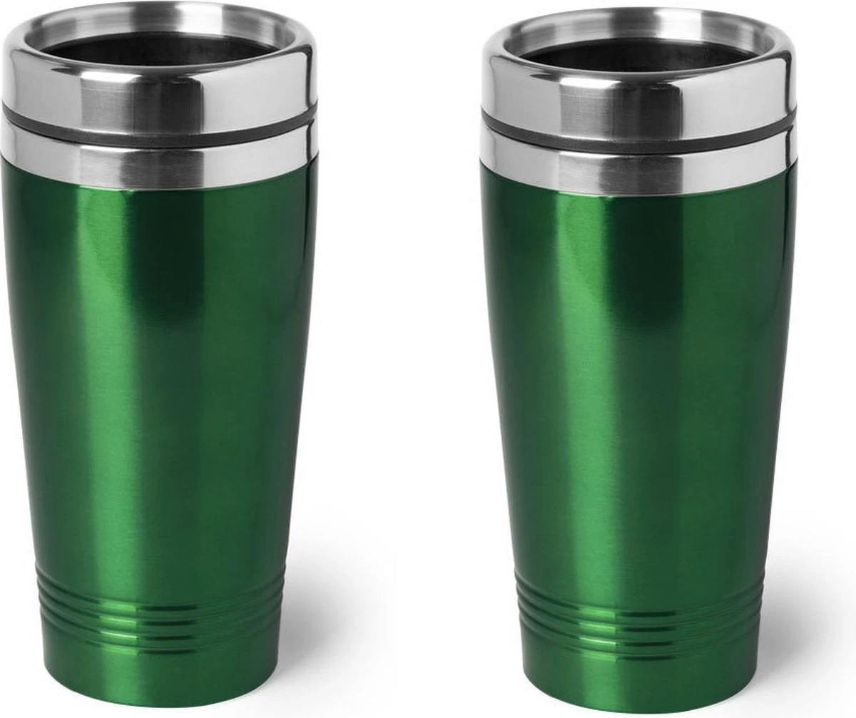 8x pièces en acier inoxydable Tasse au chaud / Tasse au chaud vert métallique. Tasse isotherme / thermos en acier inoxydable d’une capacité de 450 ml. Double paroi pour une meilleure et plus longue rétention de la température du liquide. Couvercle de sécurité et fond en mousse souple. Pour café, thé et boissons chaudes. Mugs de voyage. Taille: 18 x 8 cm.