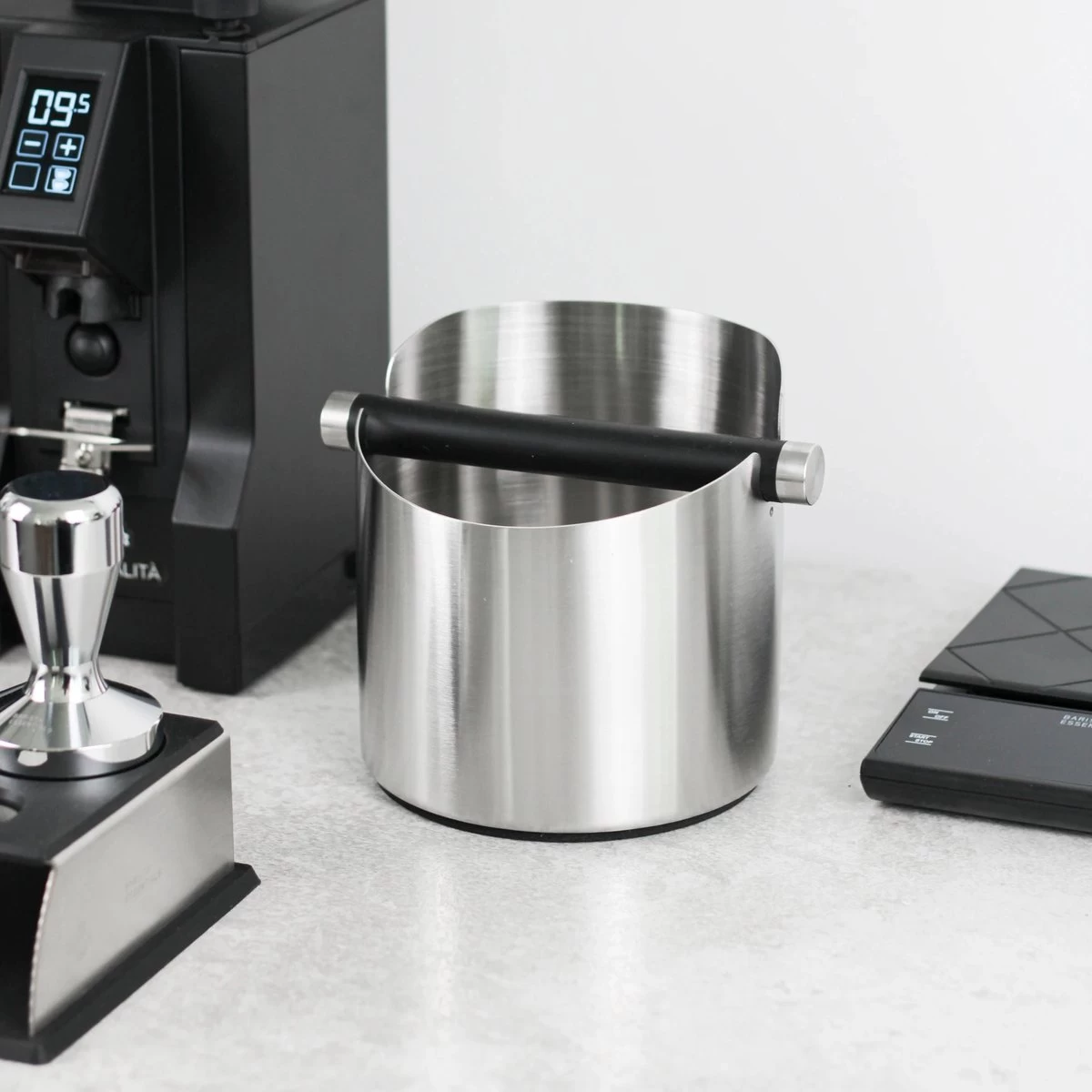 La barre de frappe en caoutchouc est amovible mais fermement fixée et absorbe à la fois les coups et le son lorsque vous assommez votre porte-filtre. Le fond antidérapant garantit que ce plateau à frapper ne bouge pas lorsque vous frappez votre café.