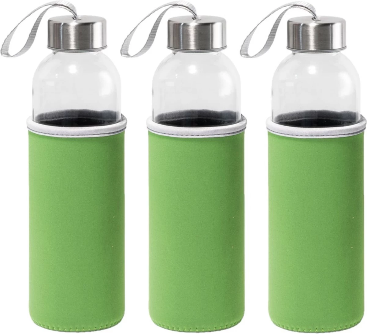 Bouteille D’eau / Gourde En Verre 3x Pieces Avec Housse De Protection Softshell Verte 520 Ml – Bouteille De Sport – Bouteille De Sport