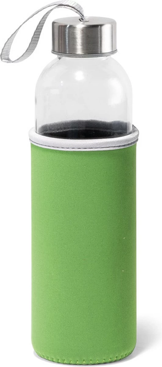 Bouteille d’eau/bouteille en verre 3 pièces avec couvercle en softshell vert et bouchon à vis en acier inoxydable avec poignée. Dimensions : environ D6,5 x H22,5 cm. Contenu : environ 520 ml, 52 cl. Matière : verre trempé. Sans Bpa : oui. Convient au micro-ondes : oui. Passe au lave-vaisselle : oui, le bouchon ne l’est pas. Convient au congélateur : oui. La housse est lavable en machine.