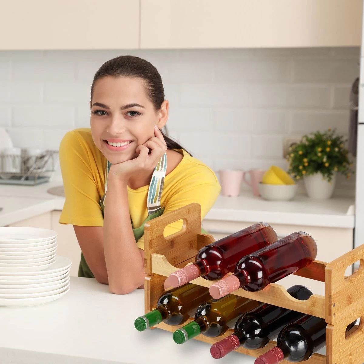Cet élégant casier à vin en bambou de haute qualité convient pour stocker 8 bouteilles de vin sur 2 couches. Mais le support convient également comme espace de stockage pour d’autres bouteilles de boissons. Le casier à bouteilles de vin peu encombrant est particulièrement remarquable pour son aspect naturel et sa conception flexible. Utilisez les 2 pièces séparément ou empilez-les l’une sur l’autre grâce aux poignées pratiques. Grâce à la résistance à l’humidité du matériau, le casier à bouteilles moderne convient à une utilisation dans la cuisine ainsi que dans le bar de la maison. Casier à vin en détail – Dimensions totales H x L x P: environ 24 x 47 x 18 cm – Crans H x L: environ 2,5 x 7 cm – Poignées H x L: environ 3,4 x 8 cm – Poids : environ 1,3 kg – Charge jusqu’à environ 15 kg par étage – Matériau: Bambou – Couleur: Naturel Support à boissons pour 8 bouteilles – Espace de rangement pour un total de 8 bouteilles – Pour vin, champagne, eau, etc. – Idéal pour la cuisine ou Bar à la maison – À utiliser individuellement ou empilé – Stockage efficace du vin (horizontalement) Contenu de la livraison – 1 x Casier à bouteilles en pièces – Avec matériel de montage et manuel avec photos – La décoration n’est pas incluse
