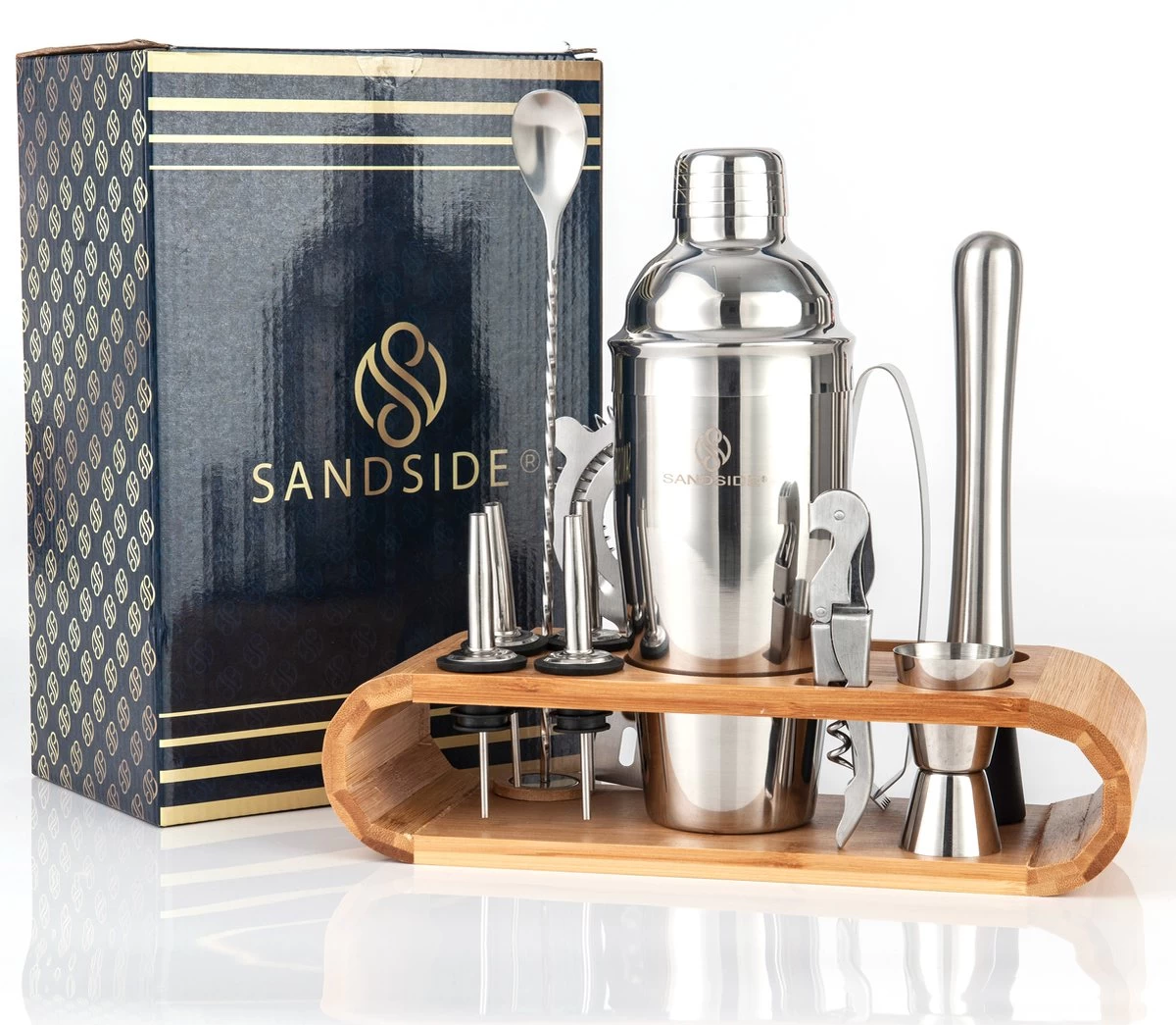Cet ensemble à cocktail est livré avec un shaker à cocktail pratique de 750 ml dans lequel vous pouvez préparer n’importe quel cocktail en un rien de temps ! Il contient également un support en bambou pratique et un ouvre-bouteille multifonctionnel.