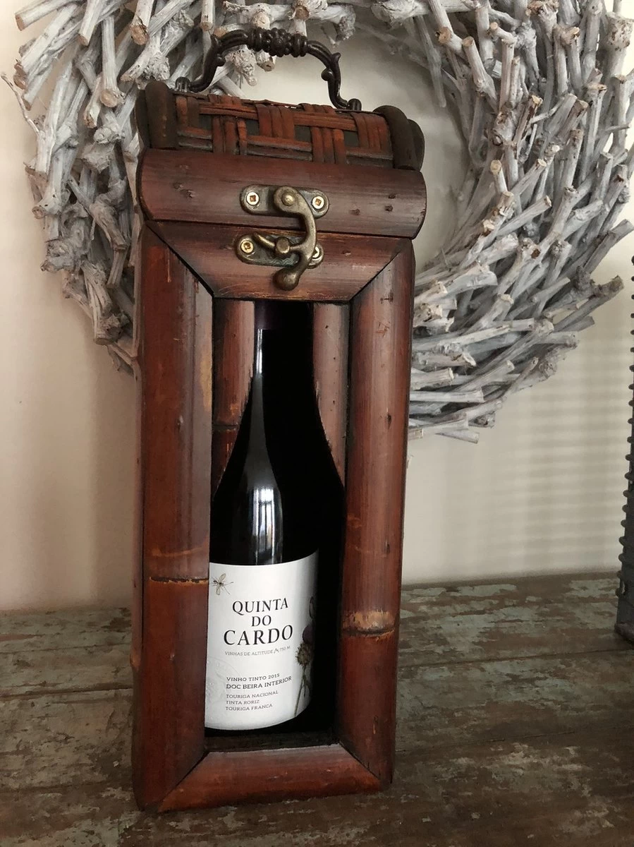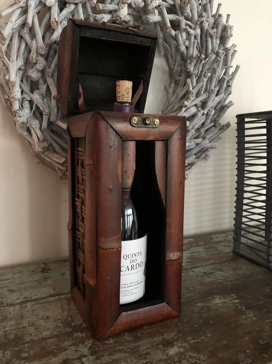Un joli cadeau pour une bouteille de vin. coffret en bois colonial pour une bouteille de vin, debout, finition bambou, très spécial !