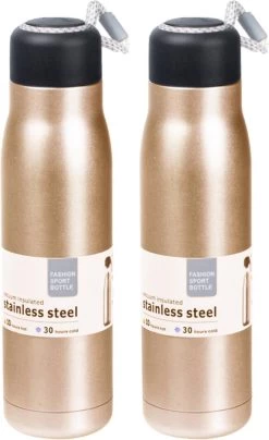 2x thermos en acier inoxydable / flacons isothermes pour les déplacements 550 ml. Cette bouteille isotherme possède une isolation à double paroi qui permet de maintenir les températures chaudes et froides. L’intérieur et l’extérieur sont en acier inoxydable. Dimensions : 7x26cm. Contenu: 550 ml. Couleur: or.