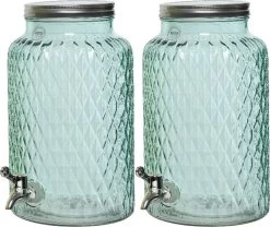 2x distributeur de boissons/robinet de limonade Decoris pour eau, jus et limonade. Retirez le couvercle tournant et remplissez facilement le robinet avec votre boisson préférée. Le couvercle hermétique assure une bonne conservation de la boisson. Après utilisation, le distributeur est facile à nettoyer à la main. Matière : verre. Diamètre : environ 18 cm. Hauteur : environ 25 cm. Contenu: environ 5,5 litres.