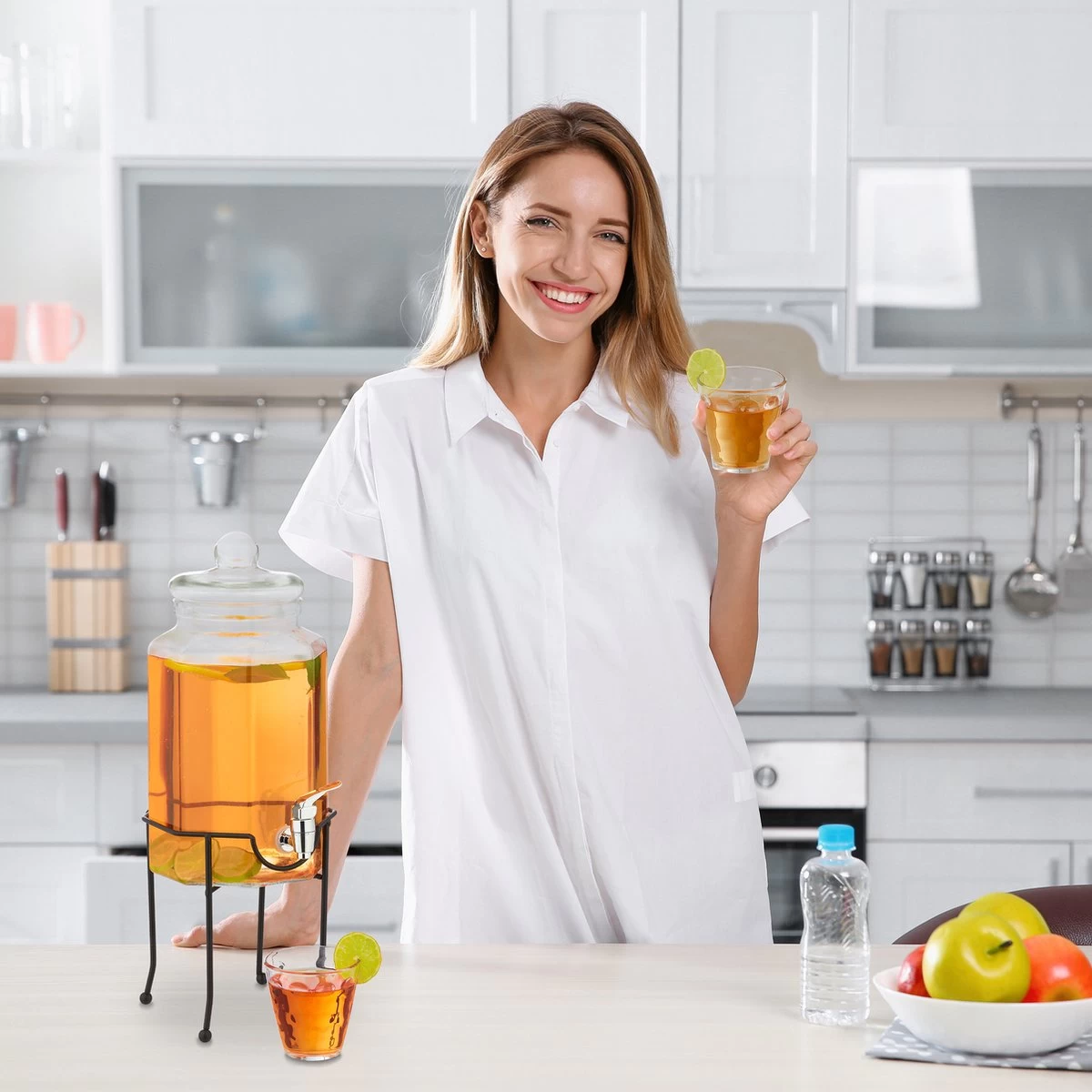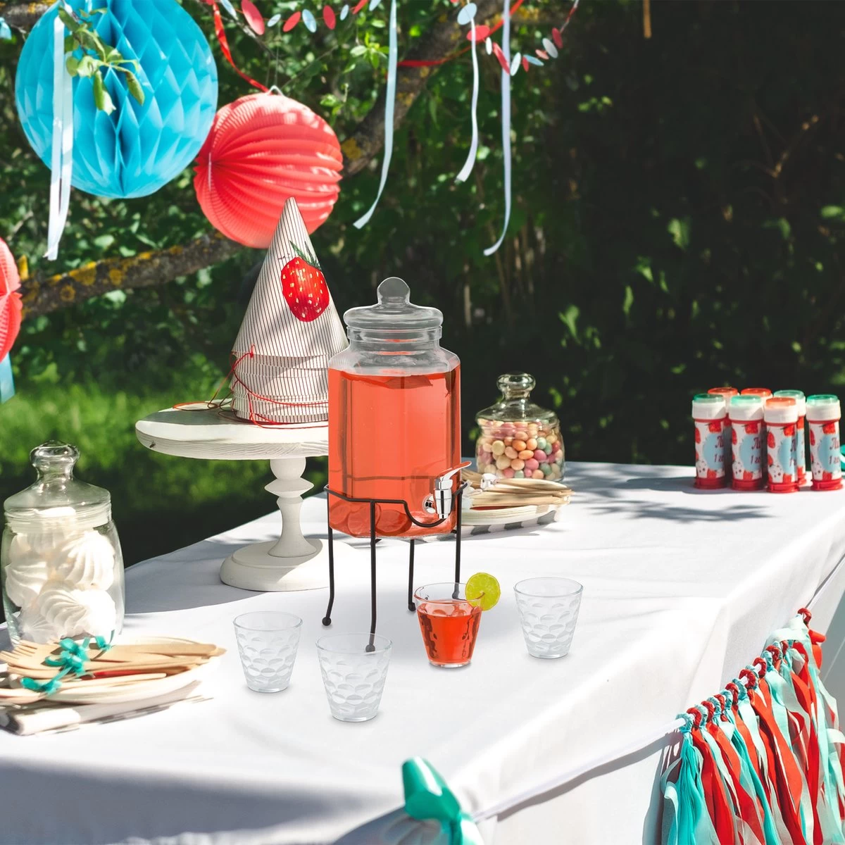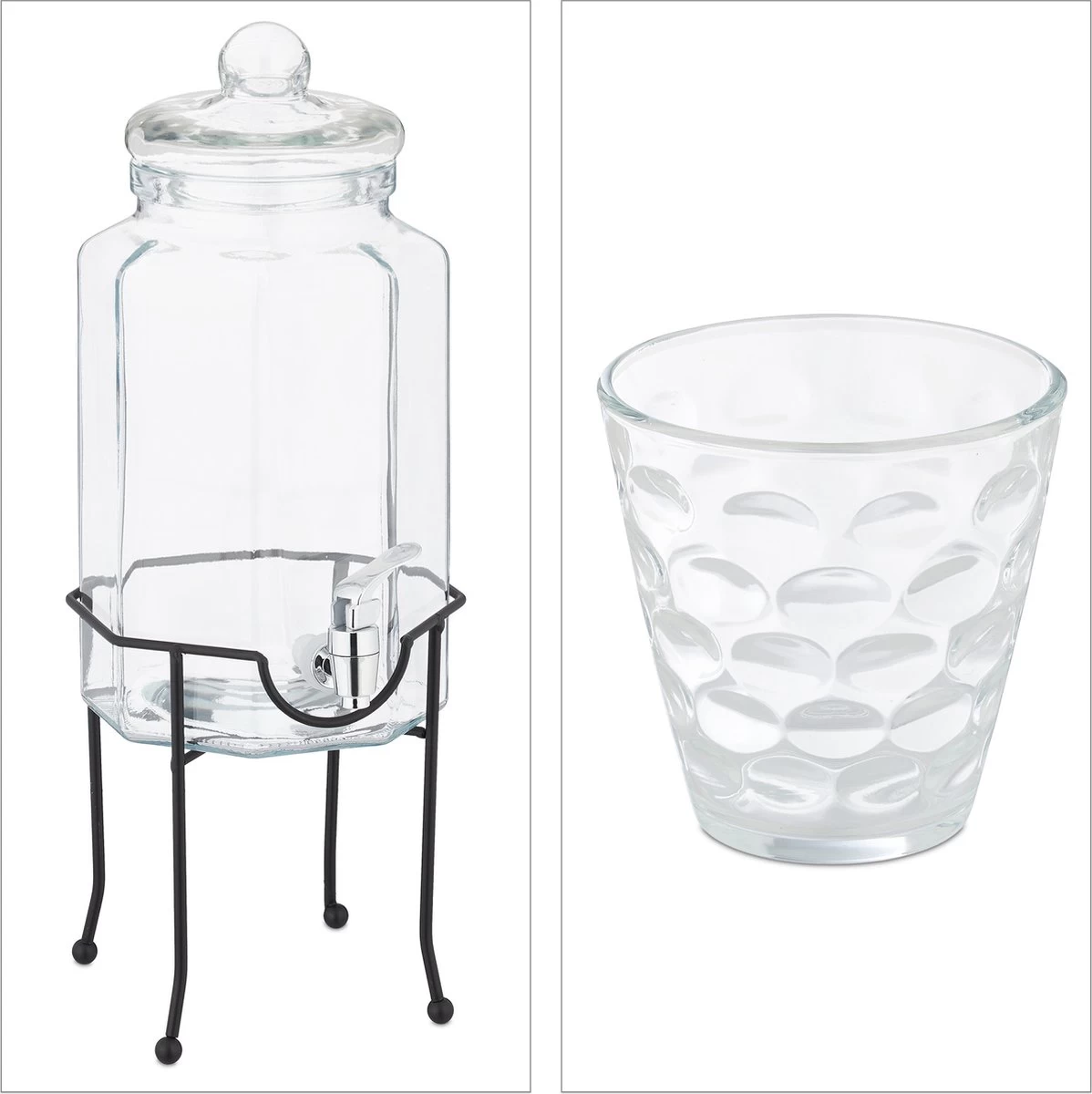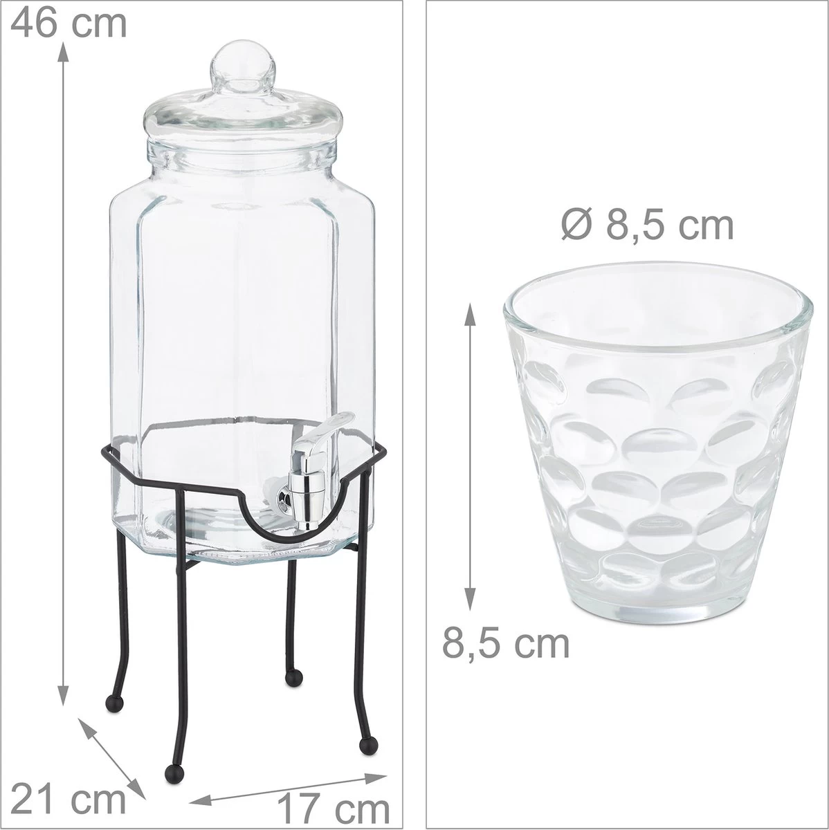 Cet ensemble de robinets à limonade au design standard est indispensable pour les anniversaires et autres occasions. En plaçant le distributeur de boissons dans le support, il prend tout son sens et est immédiatement prêt à l’emploi. À l’aide du joli robinet, vous pouvez verser des jus de fruits faits maison, des limonades, des cocktails ou de l’eau directement dans les verres, qui sont également inclus dans la livraison. Offrez à vos visiteurs des boissons rafraîchissantes grâce aux 4 verres décoratifs.
