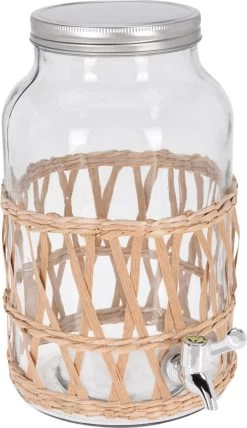 Robinet/distributeur de boissons à limonade en Verres 5,5 litres. Utilisez le distributeur de verre pour remplir votre boisson préférée ! Idéal pour une fête d’enfants à remplir de limonade, ou pour une soirée à thème avec un cocktail. Équipé d’un robinet et d’un couvercle hermétique à vis. Contenu: 5,5 litres. Taille : environ 18 x 30 cm. Matière : verre et rotin.