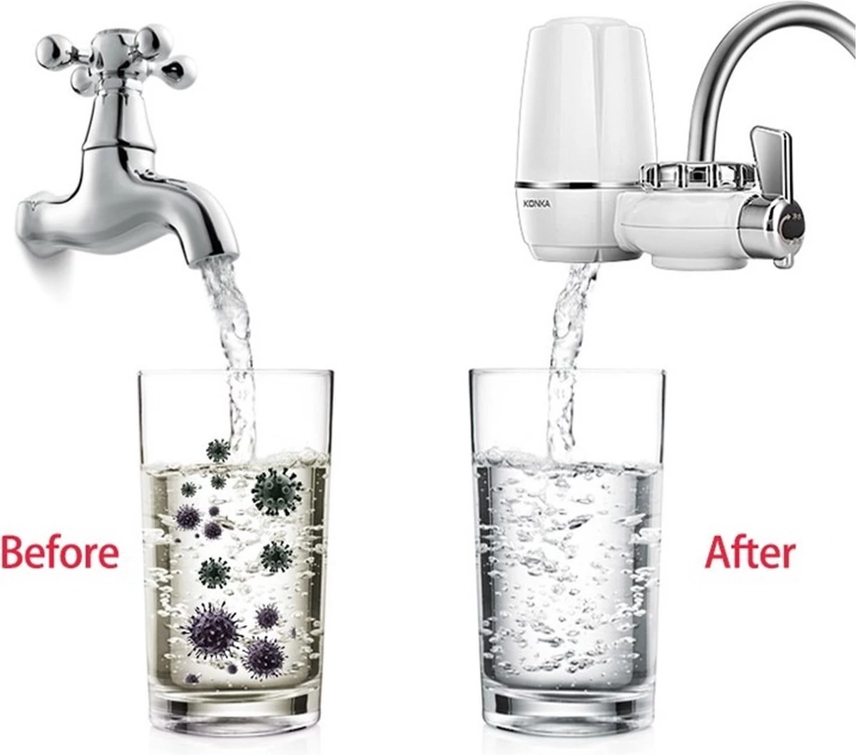 Facile – IlDispositif de purification d’eau de Konka est très facile à utiliser, vous avez juste besoin duAppuyez sur le filtre uniquement à monter sur le robinet avec la bague puis tourner le robinet pour basculer entre l’eau du robinet et l’eau purifiée. Tout le monde peut le faire.