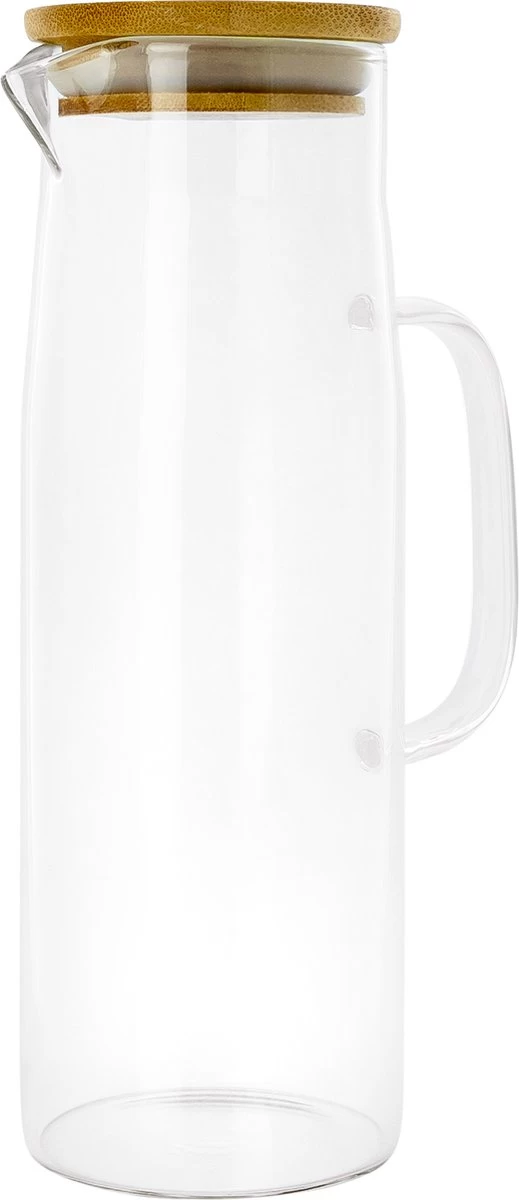 La carafe elle-même est en verre, tout comme la poignée fine et élégante. Le couvercle de la carafe est en bois, ce qui crée un bel effet. La carafe en verre avec couvercle et poignée en bois n’a pas de filtre, mais le couvercle retient les gros morceaux de fruits.