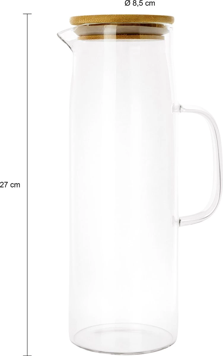 La carafe avec couvercle en bois a une capacité de 1,5 litre. Le contenu de la carafe permet de remplir plusieurs verres, mais en même temps, la taille de la carafe est agréable à porter. Vous emportez la carafe dans le jardin par une chaude journée ou vous mettez une boisson sur la table lorsque vous avez des invités.