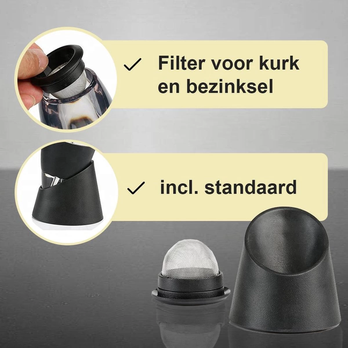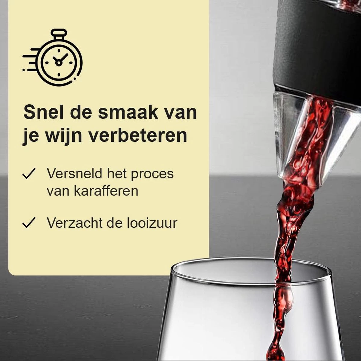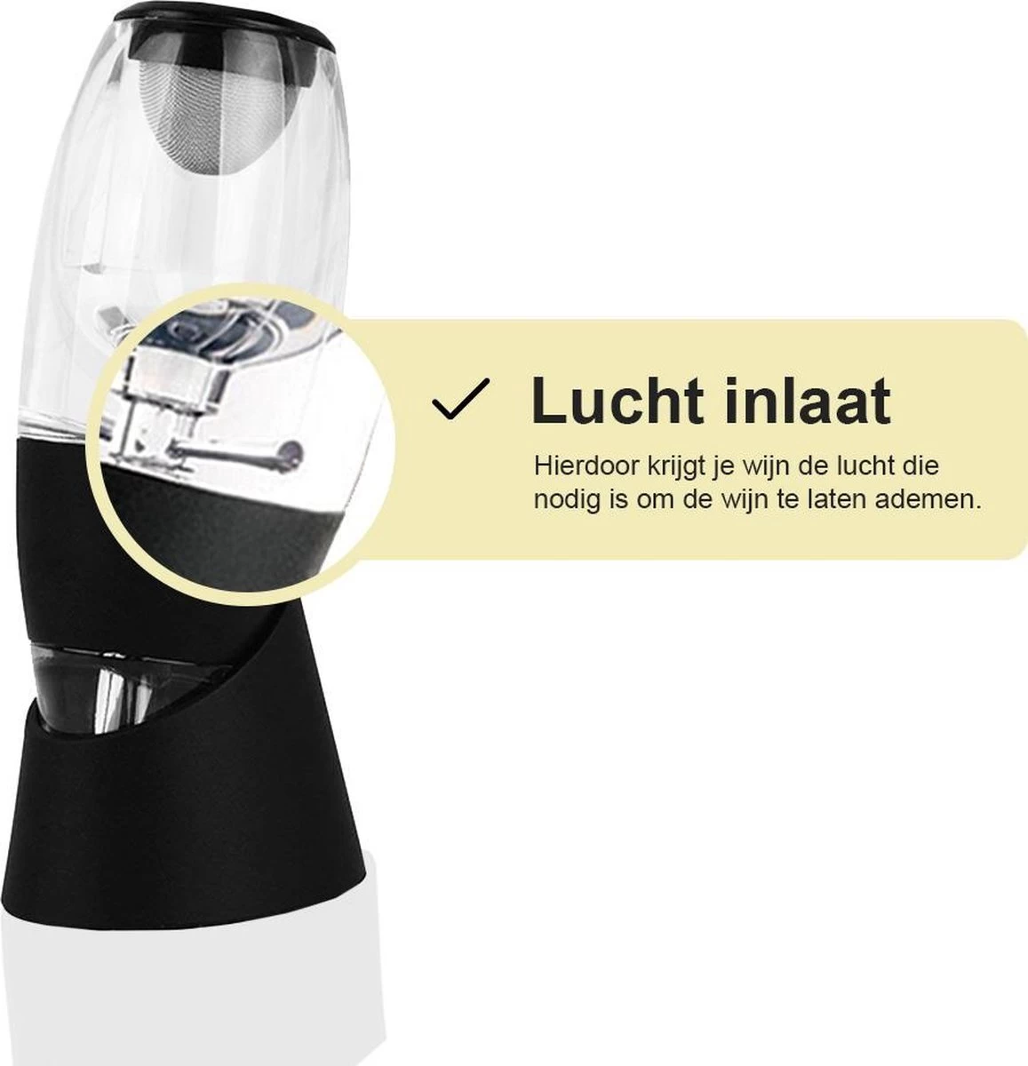 Avec la carafe à vin, vous vous assurez que le vin commence à respirer et que les sédiments de la bouteille se retrouvent dans le tamis plutôt que dans votre verre. Cela vous permet de profiter davantage de votre vin grâce à son goût et à ses arômes pleins. Ouvrez une bouteille de vin et versez-la dans la carafe à vin de luxe. Tout d’abord, le vin passe à travers le tamis et le sédiment est séparé du vin. Ensuite, le vin coule à travers la carafe et obtient l’air dont il a besoin pour que le vin respire. Lorsque le vin a été versé, vous pouvez immédiatement consommer le vin. Après utilisation, la carafe à vin peut être facilement nettoyée en la rinçant sous le robinet chaud. Berg puis ceci en plaçant l’aérateur dans le support inclus.