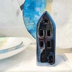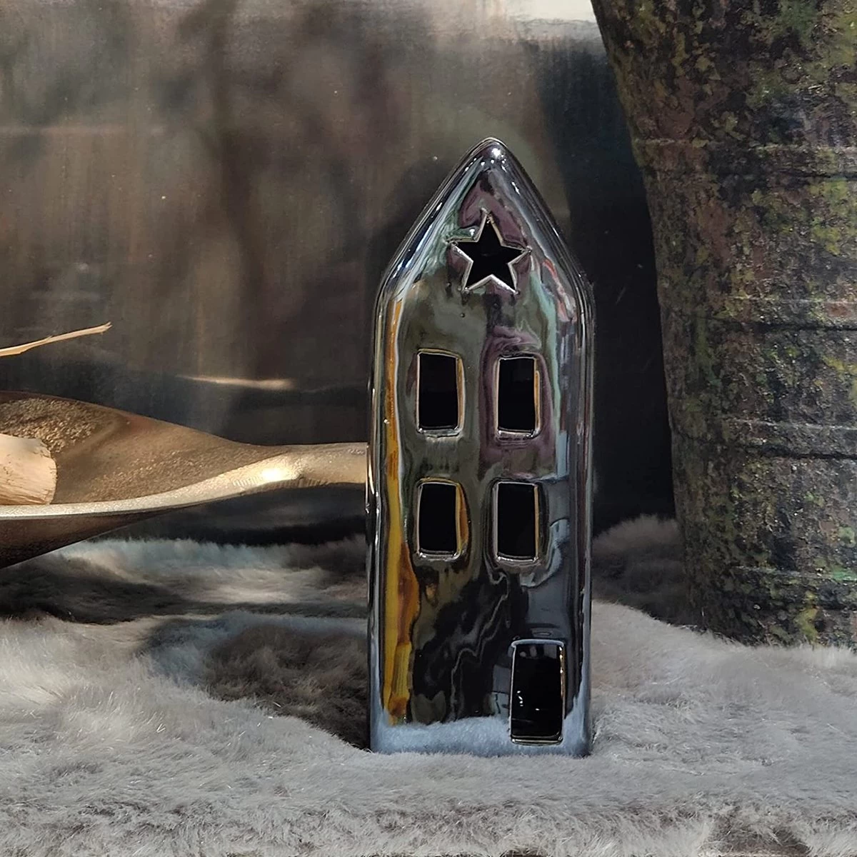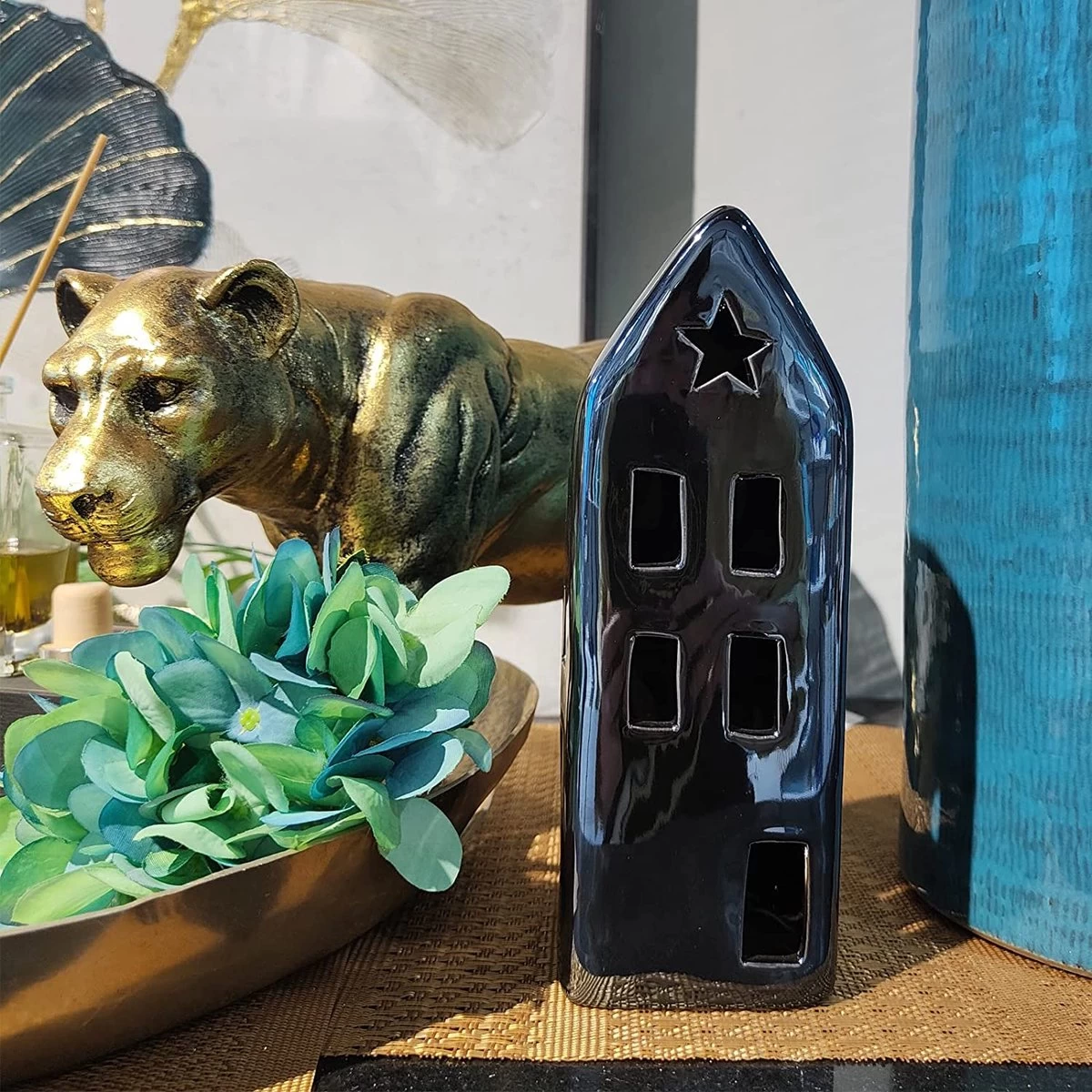 - Le magnifique photophore en céramique est décoré dans le look « maison » unique dans les tons noir et crème.