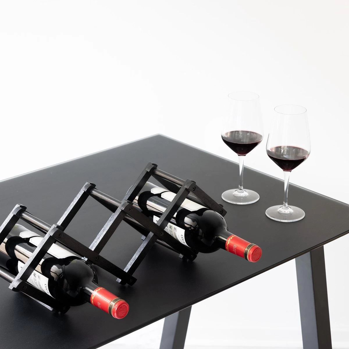 - PLIABLE: Le porte-vin peut facilement être placé sur n’importe quelle surface plane. Le rack est pliable et peut donc également être bien rangé. Une fois plié, il mesure 22 x 12 x 6,5 centimètres.