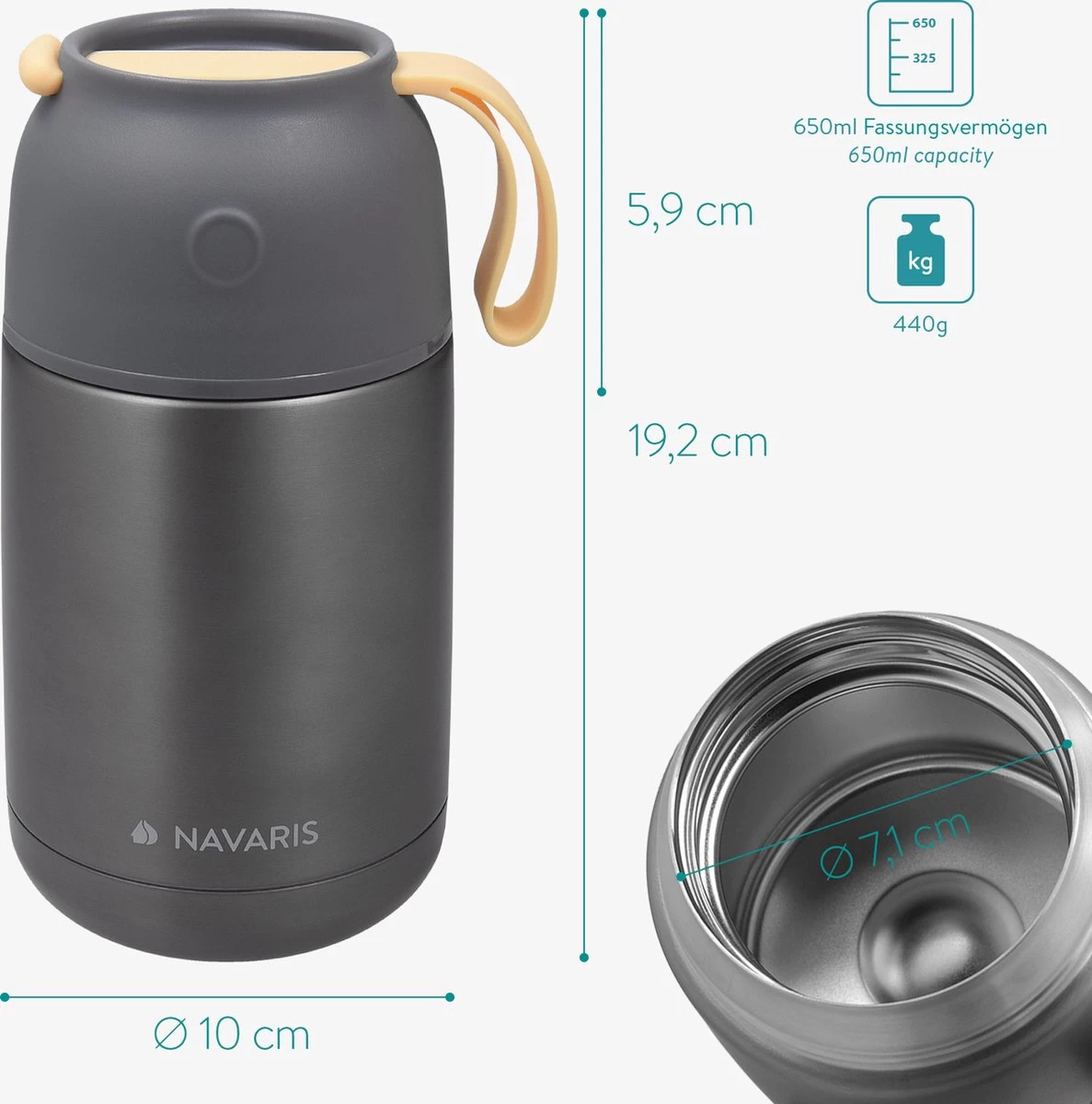 - CHAUD ET FROID : La tasse en acier inoxydable Navaris garde les aliments chauds ou froids. Les aliments chauds restent chauds pendant 9 heures et les aliments froids restent bien frais pendant 12 heures.