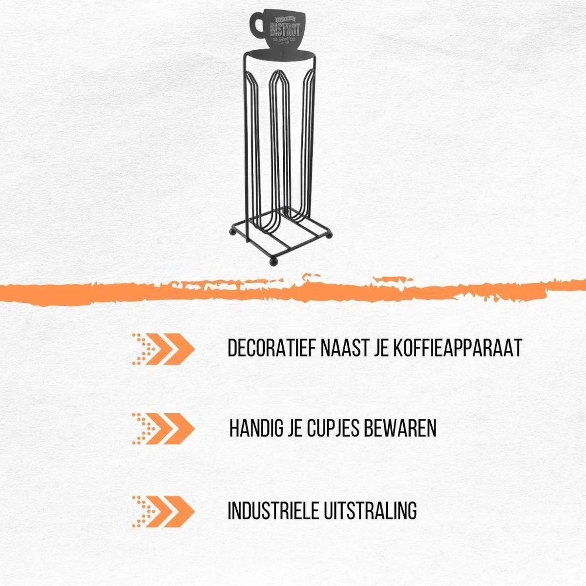 Le porte-gobelet est divisé en 4 compartiments différents dans lesquels vous pouvez trier les tasses, par exemple par goût. De cette façon, vos tasses sont organisées et vous pouvez les trouver rapidement. Vous pouvez les empiler et lorsque vous en avez besoin, vous pouvez le saisir en haut. Le porte-capsule a un look industriel et s’intègre donc parfaitement dans ce style d’intérieur!