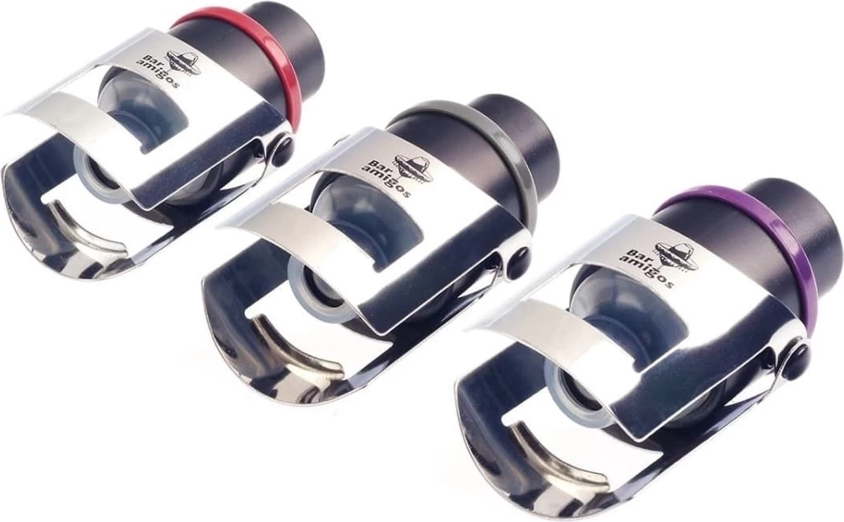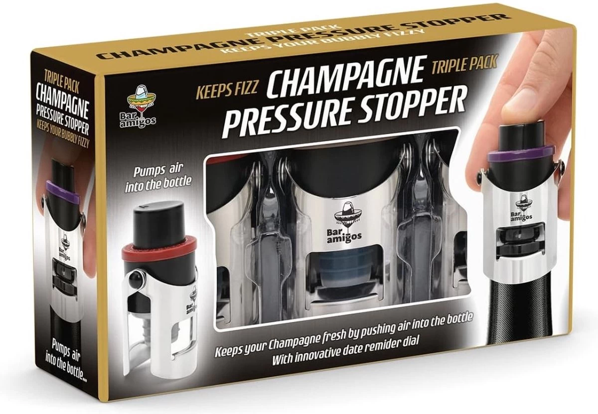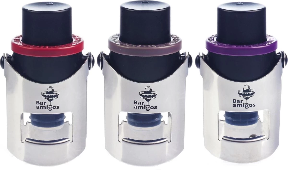 Vous en avez assez de voir votre bouteille s’écouler rapidement à plat ? Nous avons la solution ! Le bouchon à pression Champagne Bar Amigos ® retient le mousseux pour préserver ce champagne au goût parfait. Notre système technologique breveté fonctionne grâce à l’air pompé dans la bouteille, ce qui permet de maintenir les bulles à l’intérieur en scellant la pression. Notre cheval de champagne peut également être utilisé sur des vins mousseux tels que le prosecco et, grâce à un pratique bouton de rappel de date, vous saurez toujours quand vous avez sauvé votre plongé. Notre bouchon convient à la plupart des bouteilles normales et est garanti trois ans après des tests de qualité rigoureux. Maintenant disponible dans un pack trio avec des jantes rouges, grises et violettes.