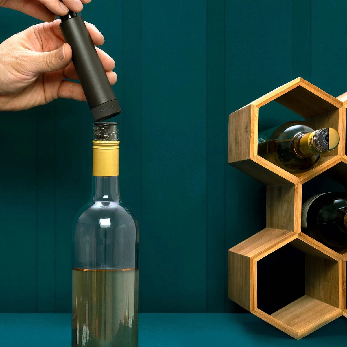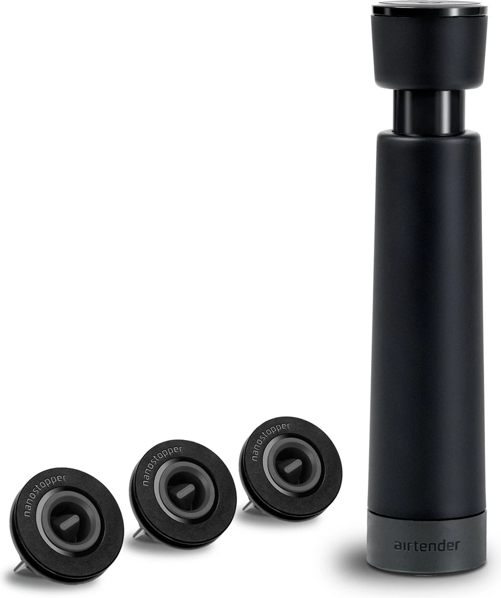 Gardez le vin frais plus longtemps et parfaitement parfumé. Stockez les bouteilles ouvertes à l’abri des fuites sous vide dans un casier à vin, un réfrigérateur ou une armoire climatique (1x pompe à vide Airtender & 3x Nanostopper).