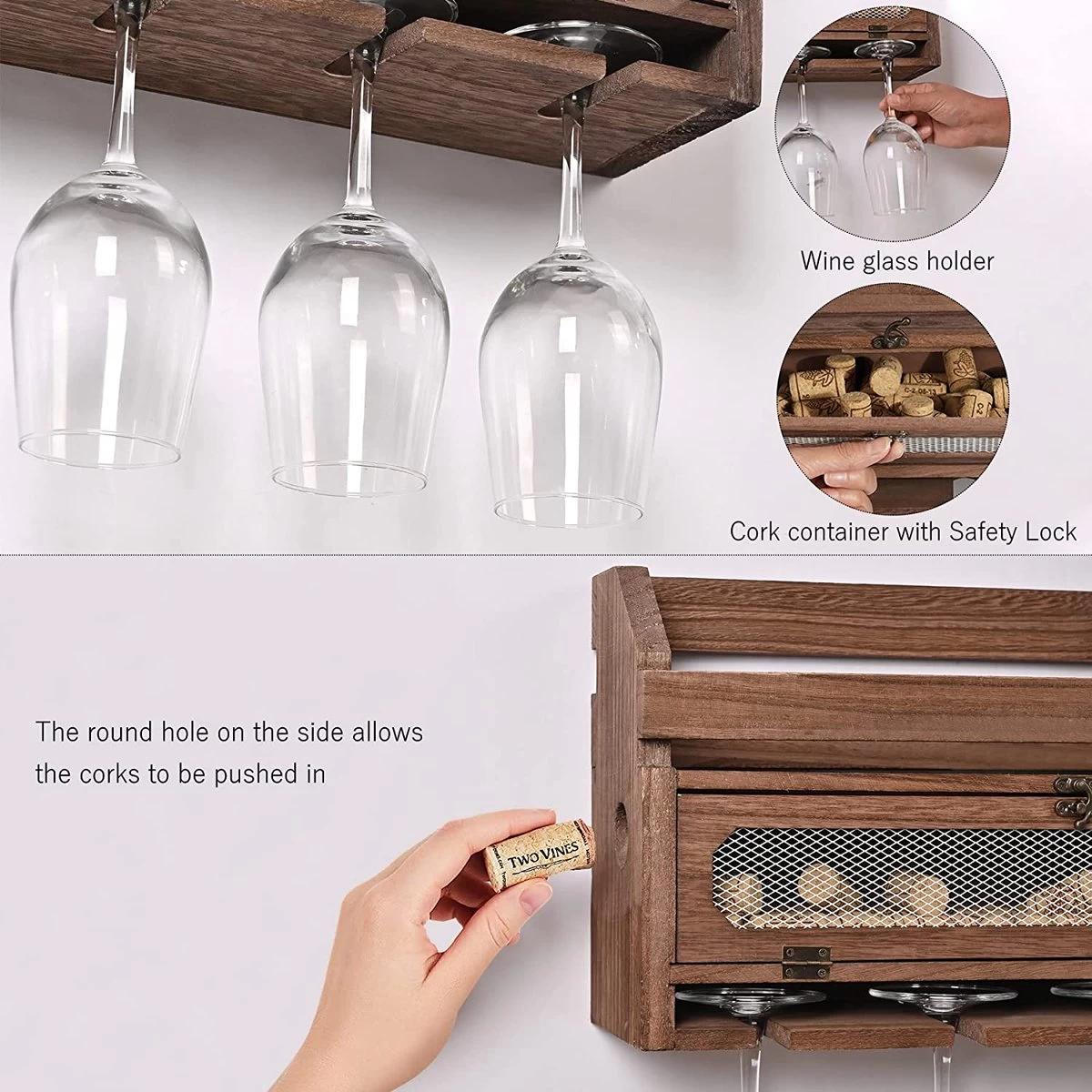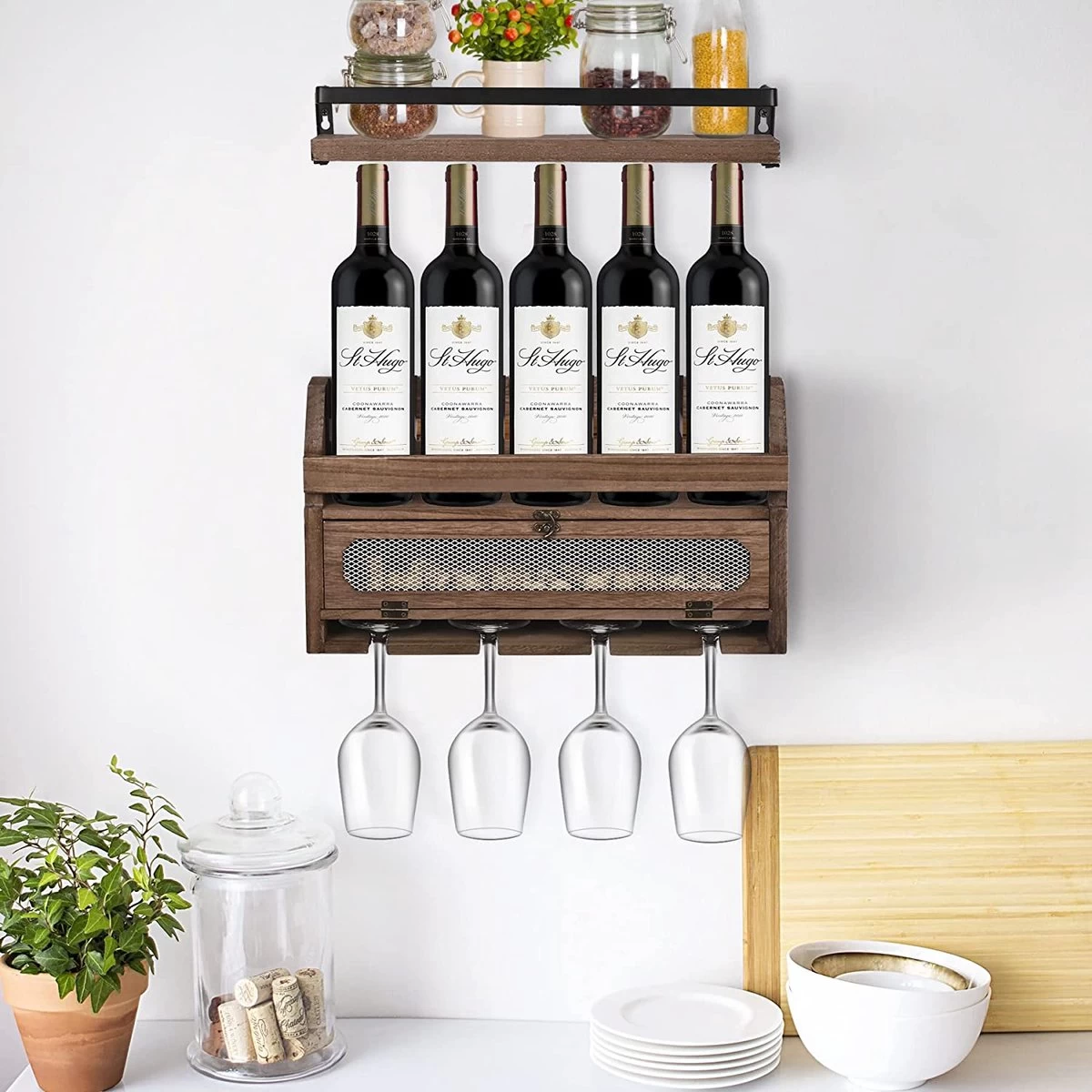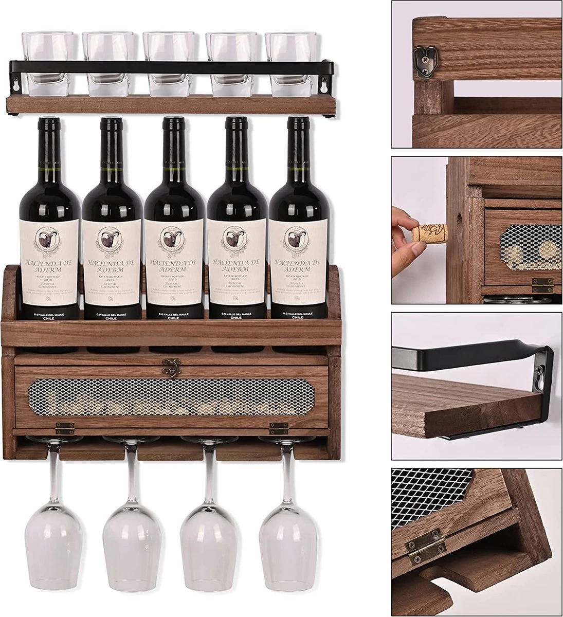 - Facile à utiliser : ce casier à vin en bois suspendu combine de manière créative un casier à vin, un porte-verre, une étagère murale et une boîte de rangement en liège ou une boîte décorative. Avec un espace pour 4-5 bouteilles de vin (selon la taille de la bouteille de vin), 4 verres et votre collection de bouchons. L’étagère supplémentaire peut être utilisée pour le whisky ou other bouteilles plus grandes ou décorée avec des ornements et des bonsaïs.