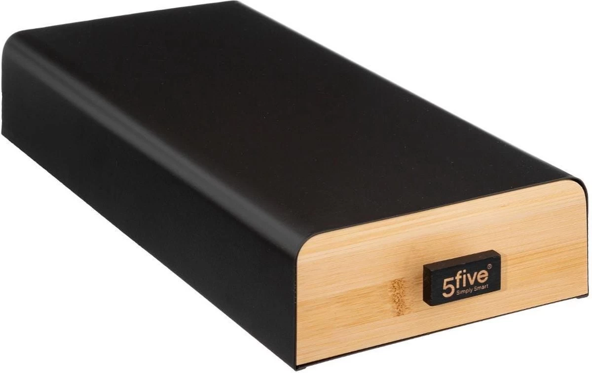 Le porte-capsule est en métal noir et possède un plateau en bambou avec le logo Five® dessus. Le petit modèle dispose de quatre compartiments de tri, le grand modèle dispose de quatre séparateurs réglables et amovibles pour que vous puissiez créer vos eigen compartiments de tri. Cette copie peut également être utilisée à la fois horizontalement et verticalement. Les deux porte-gobelets conviennent à toutes les tasses à café. Les dimensions sont les suivantes: