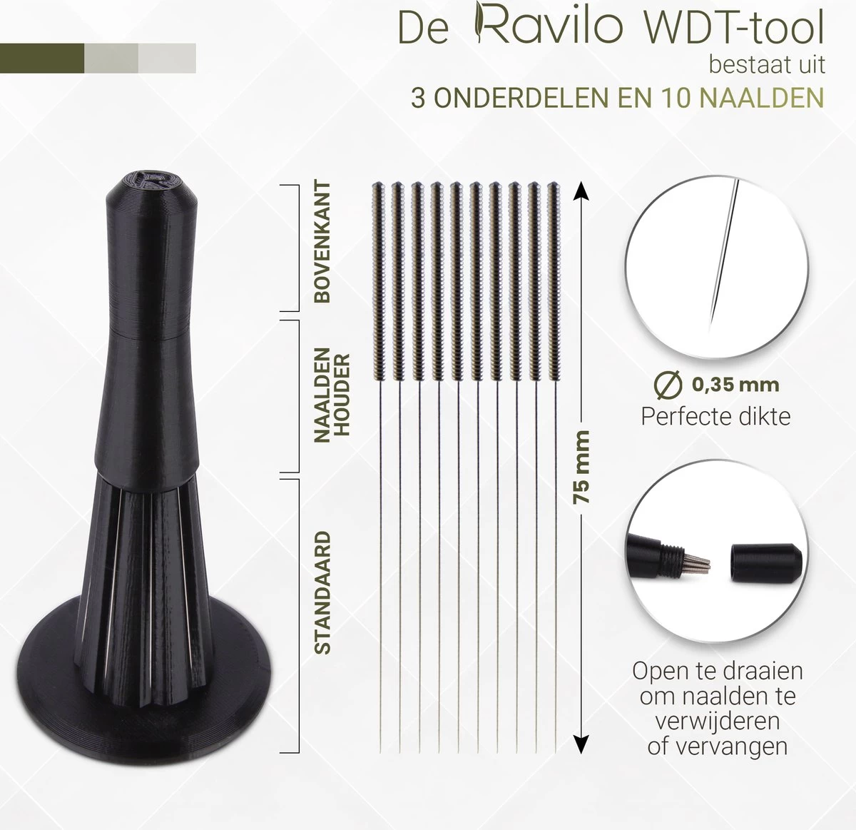 Il s’agit de l’outil Ravilo® WDT avec une conception à bouchon vissé qui peut contenir jusqu’à 10 aiguilles à la fois. Le dessus de l’outil se dévisse pour vous donner accès aux aiguilles qui peuvent être remplacées à wens . L’outil est livré avec 75 aiguilles de 0 mm. Il s’agit de la jauge à aiguille polyvalente idéale qui offre un bon équilibre entre le dé-coagulation sans beaucoup d’agitation et le fait de ne pas être trop flexible. Si nécessaire, l’outil peut être dévissé pour le nettoyer ou remplacer les aiguilles si nécessaire.
