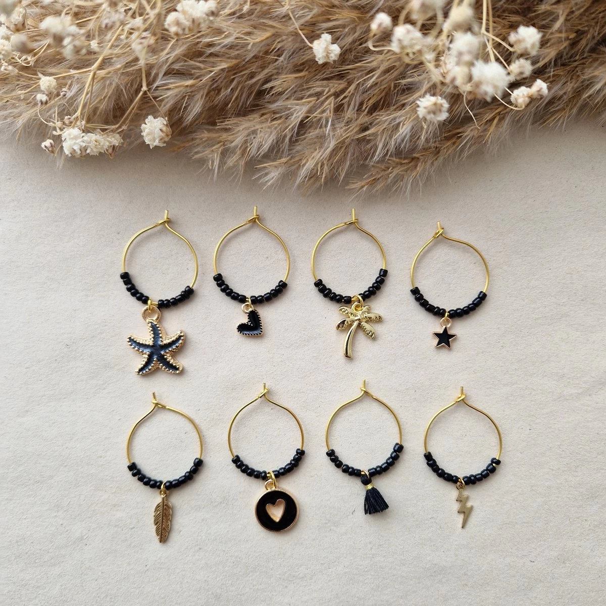 Ce joli lot de marqueurs de verre à vin de couleur noir et or, pour que vous reconnaissiez toujours votre verre à vin à la boisson ! Super pratique et méga fun à offrir en cadeau. 8 pièces!