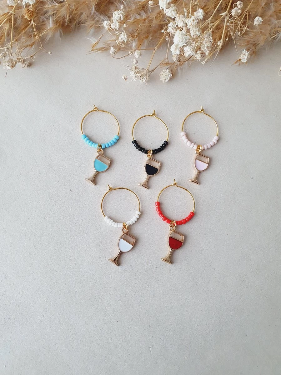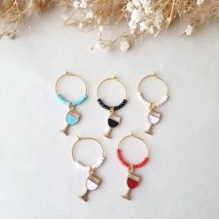 Anneaux de verres à vin avec des verres à vin en rouge, noir, rose, blanc et bleu, pour vos partenaires du vin ! Super pratique, pour que personne ne perde son verre. 5 pièces et l’ensemble est livré dans un joli sac cadeau.