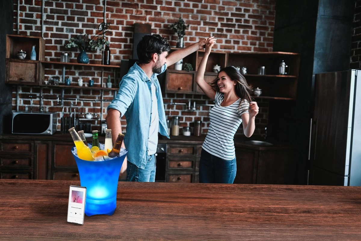 Parfait pour garder vos bouteilles au frais toute la soirée, ce seau à glace atmosphérique est doté de haut-parleurs intégrés et d’une connectivité Bluetooth pour que vous puissiez diffuser de la musique sans fil depuis votre appareil.