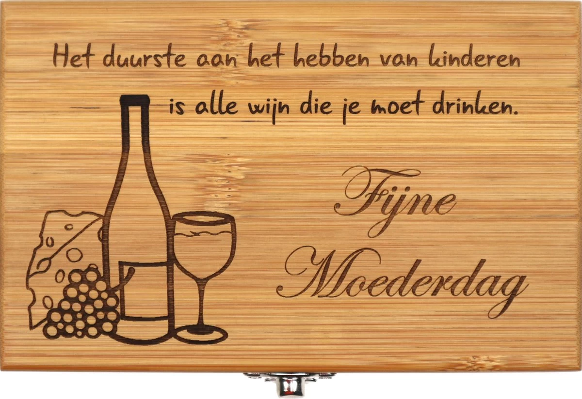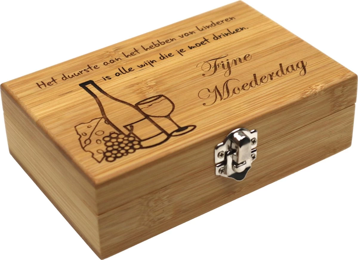La boîte en bambou est gravée d’une bouteille de vin, de fromage, de raisins, d’un verre de vin et d’un texte amusant: