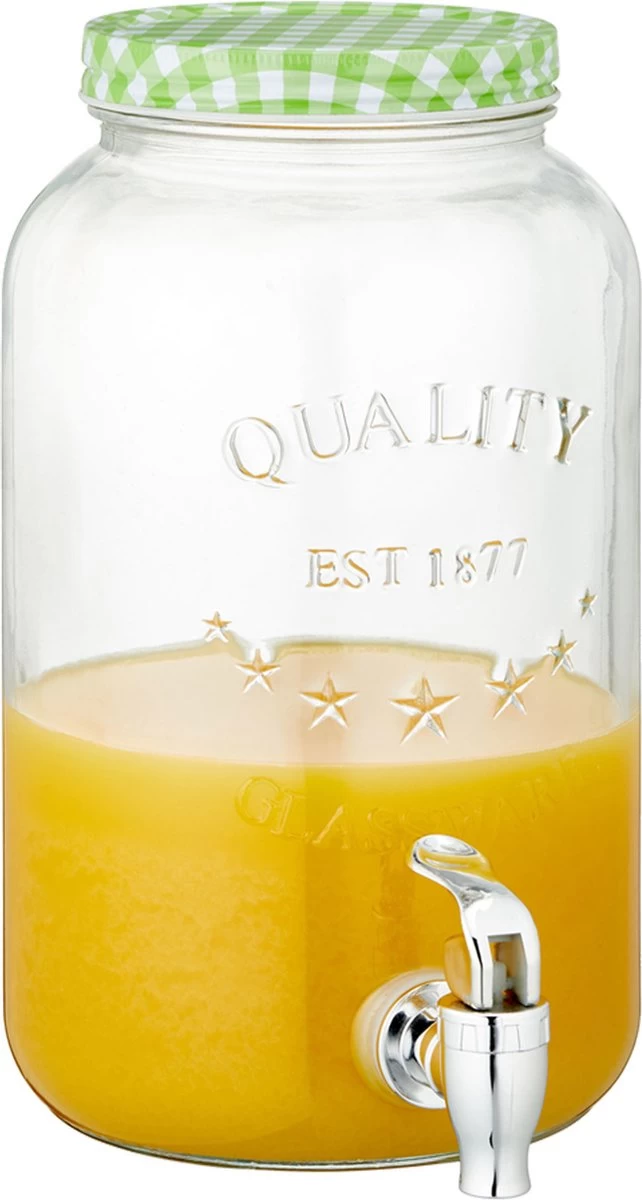 Set de 3x distributeurs de boissons / robinet de limonade 3,5 litres. Dimensions : 16x16x26cm. Matériel: verre, métal, plastique. Le distributeur est facile à ouvrir et à fermer grâce au grand bouchon à vis à carreaux vert/blanc sur le dessus. Remplir le distributeur d’une boisson alcoolisée ou non alcoolisée wens. Vous pouvez remplir un verre ou une bouteille en tournant le robinet (non inclus).