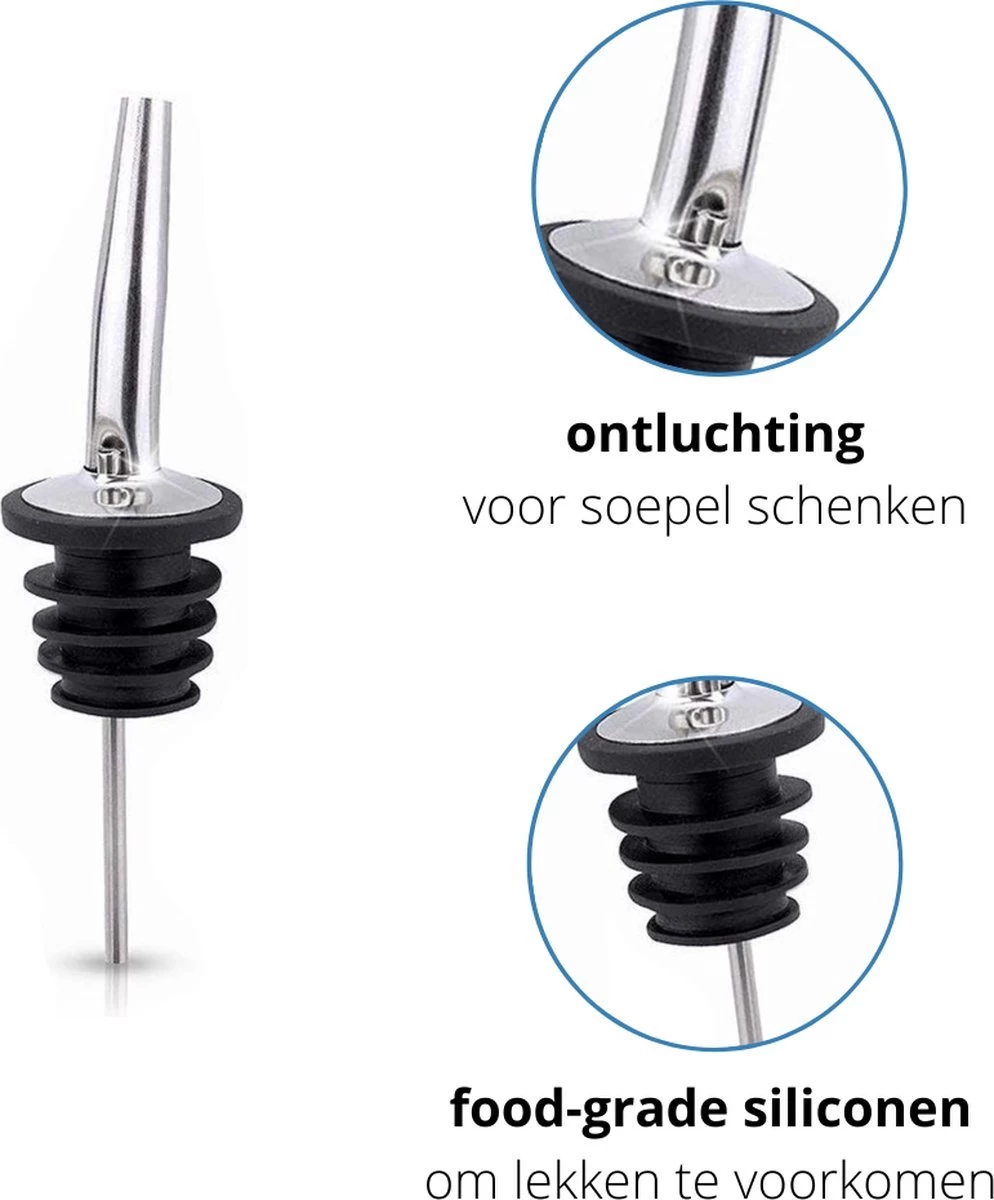 Avec ce bec verseur pratique, l’alcool n’est plus jamais gaspillé. Versez toujours la bonne quantité d’alcool avec une grande précision. Les bouchons contiennent des trous supplémentaires afin que la bouteille n’aspire pas le vide et qu’elle verse constamment la même quantité. Difficile de faire plus économique et précis !