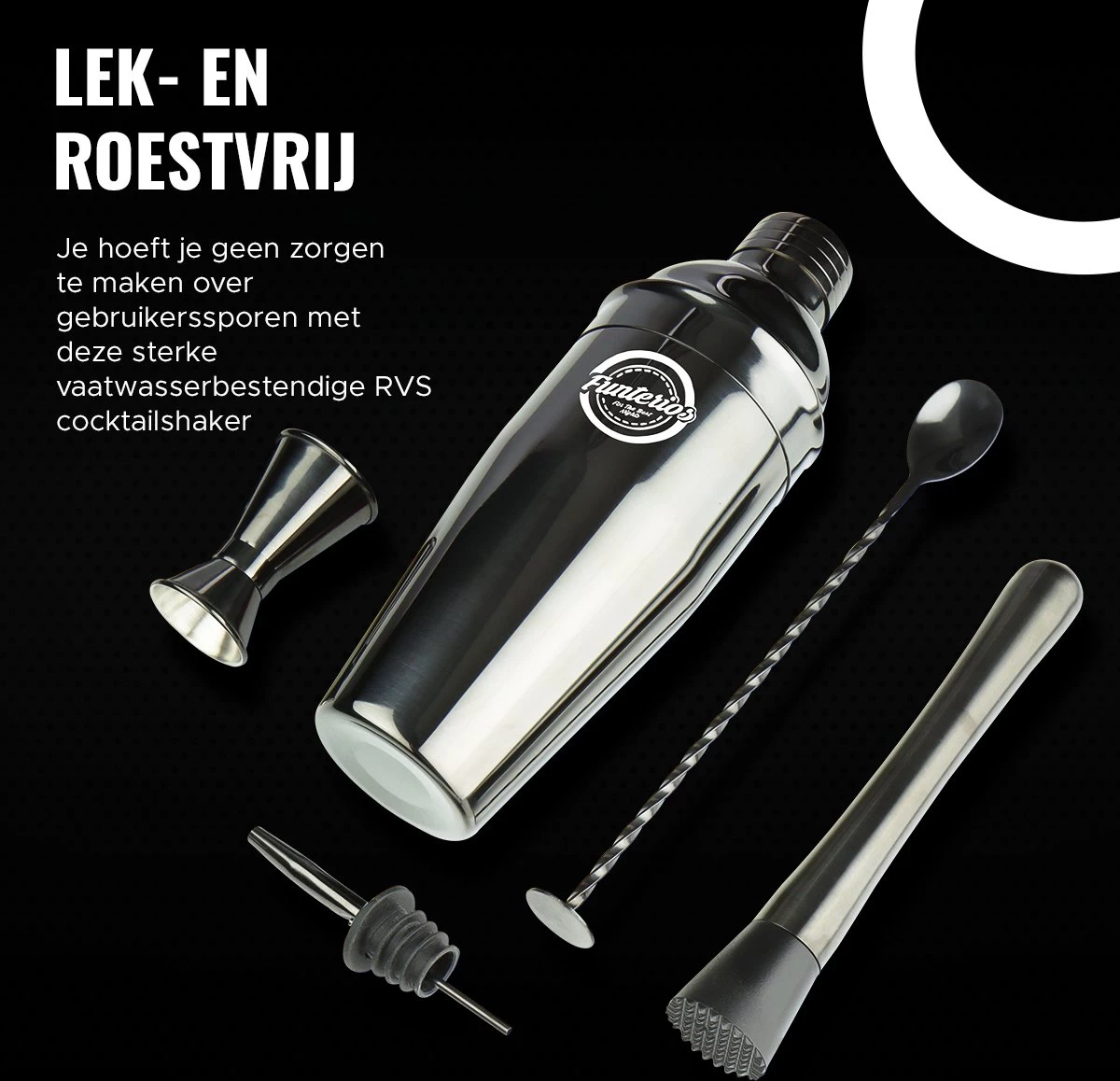 Cocktail Shaker La base de tout ensemble de cocktails, bien sûr. Pas de cocktails sans shaker. Le shaker de Funterios aune contenance de 750 ml et est étanche. Cela lui faitune plus grande capacité que le shaker moyen sur le marché. Afin que vous puissiezplusieurs verres préparez-vous en même temps !