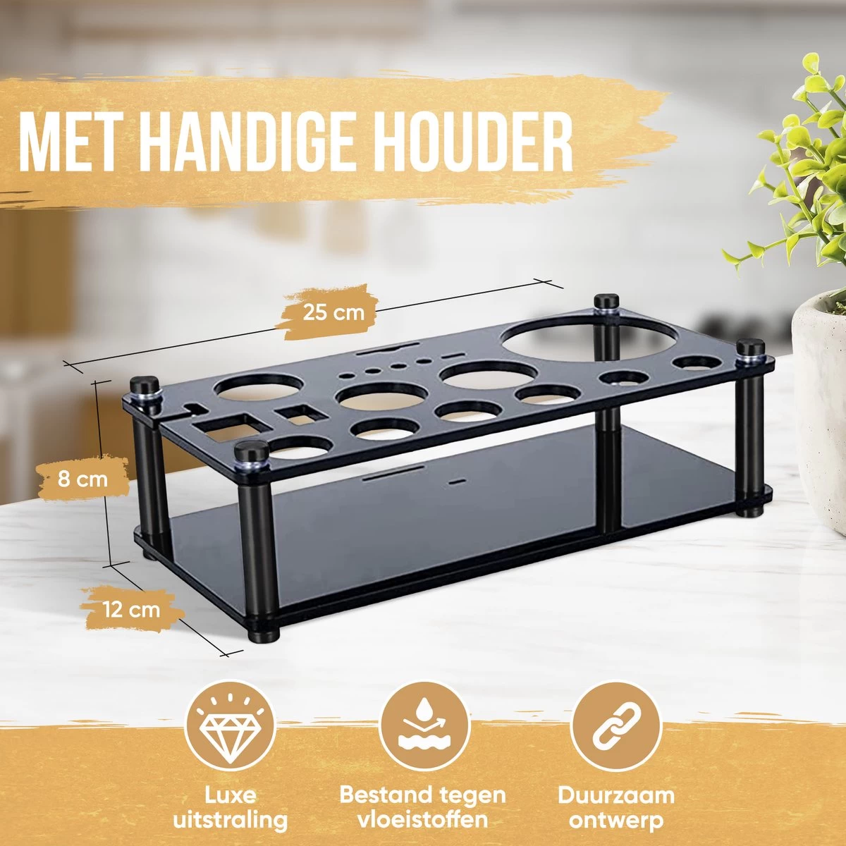 L’ensemble complet se compose de 21 produits. Pour être précis, 20 pièces et un livre de recettes imprimé (en néerlandais). Le service à cocktail est en acier inoxydable. Le support pratique dans lequel vous placez tous les accessoires est en acrylique.