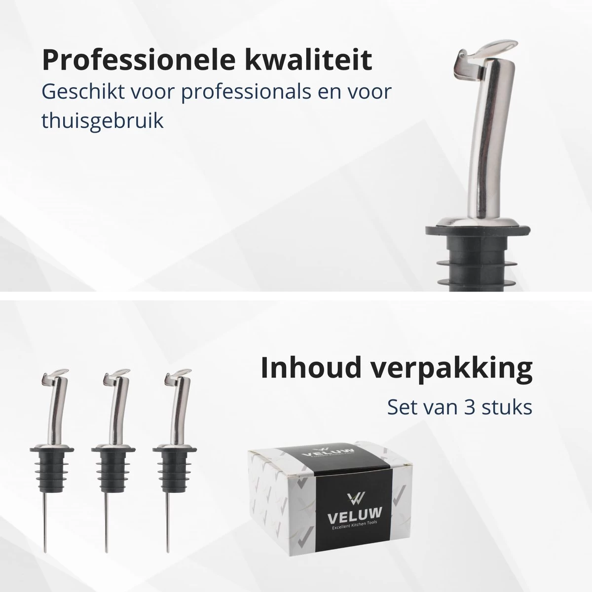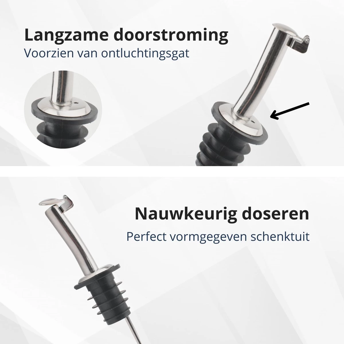 Bec verseur professionnel en acier inoxydable pour un versement dosé de boissons. Le bec verseur est en acier inoxydable pour une utilisation fréquente et est équipé d’un bouchon en caoutchouc pour éviter qu’une bouteille ne coule. Vous pouvez contrôler la quantité avec votre pouce. Ce bec est doté d’un couvercle rabattable.